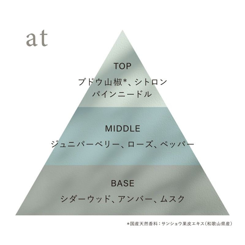 at gravity at midnight - 真夜中の引力 シダーウッドの静寂に、妖艶なアンバーとムスク、ジュニパーベリーの躍動感。スパイシーなブドウ山椒とペッパーが醸し出す未知の感覚。 トップ:ブドウ山椒*1、シトロン、パインニードル ミドル:ジュニパーベリー、ローズ、ペッパー ラスト:シダーウッド、アンバー、ムスク *1国産天然香料:サンショウ果皮エキス(和歌山県産)