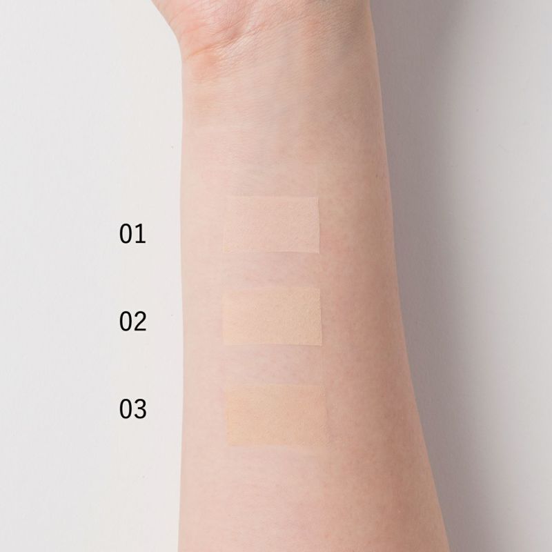01:澄んだ血色感と明るさを肌にもたらす、ピンクニュアンスのヌードカラー。 02:肌の赤みをさりげなくカバーしながら明るさをもたらす、ニュートラルなヌードカラー。 03:ヘルシーな肌印象を生み出す、ニュートラルなオークル系ヌードカラー。