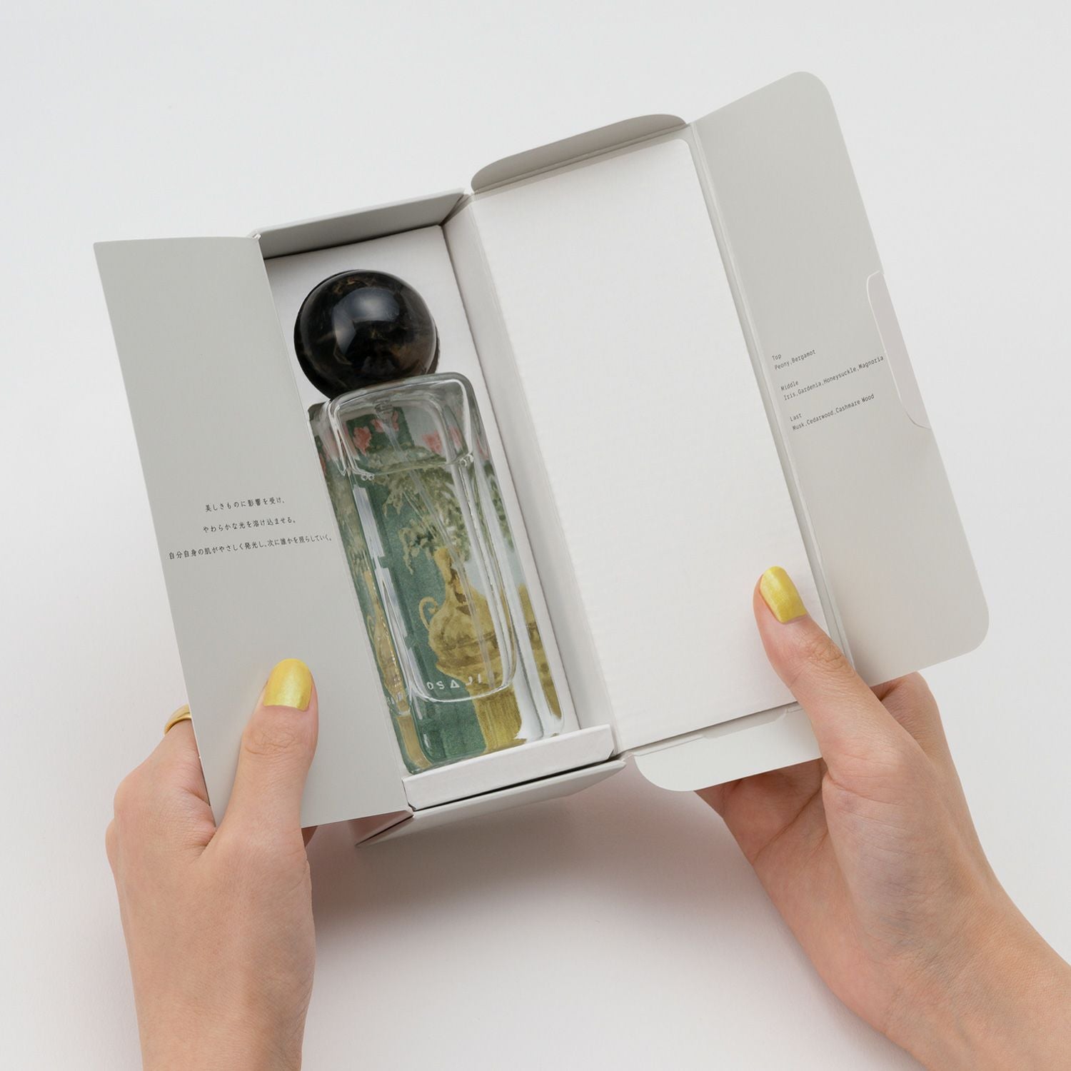 肌そのものが柔らかな光を放ち始める瞬間を描いたオードトワレ。朝露をまとったピオニーとベルガモットの透明なきらめきから、窓から降り注ぐ陽光のようなホワイトフローラルブーケの開花へ移ろっていき、ミルキーなムスクとカシミアウッドが物語を支えます。自分だけの肌の香りへと変容する、ぬくもりのあるテクスチャ。