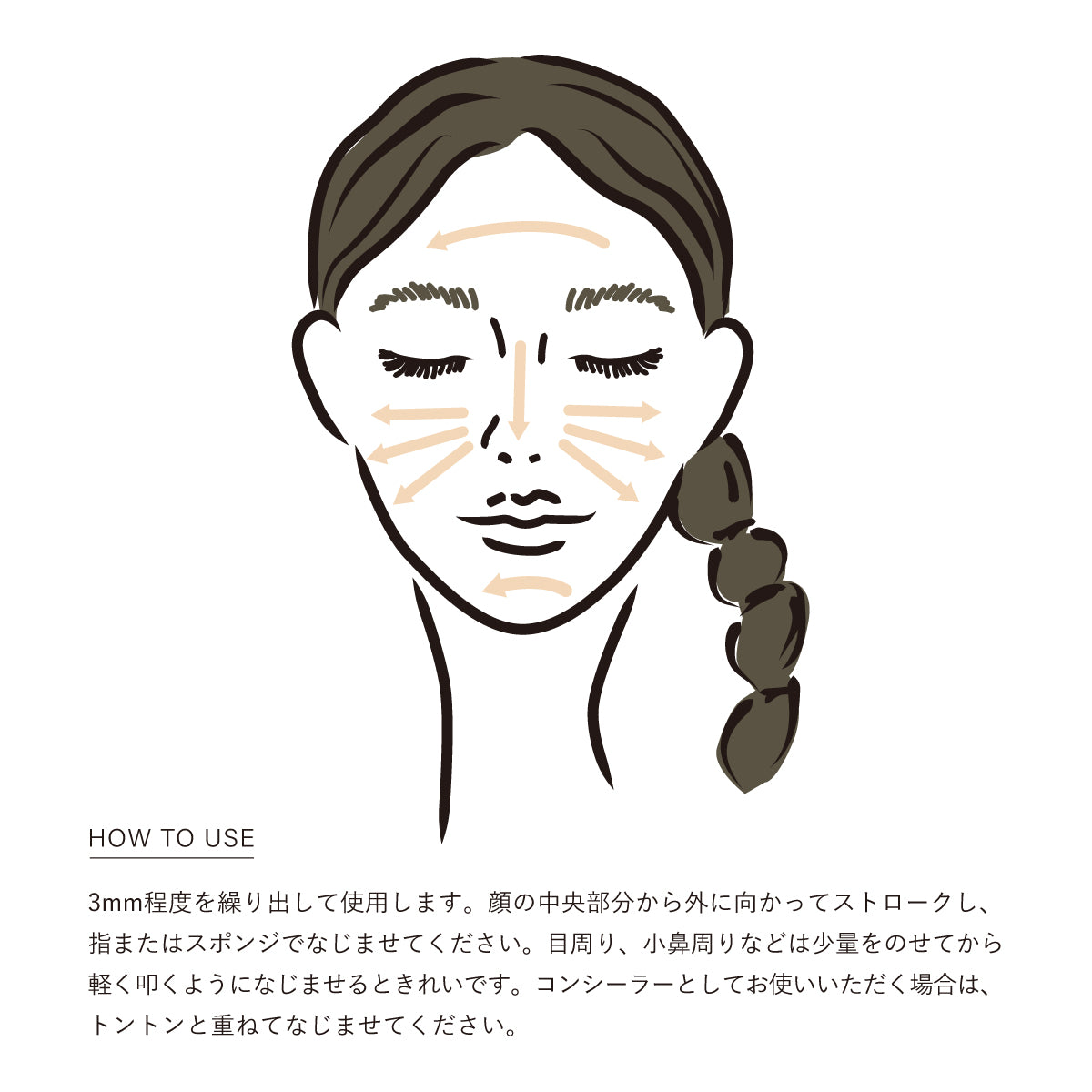 3mm程くり出し、顔の中心から外側へ向かってやさしくすべらせるように伸ばします。その後指やスポンジで馴染ませてください。