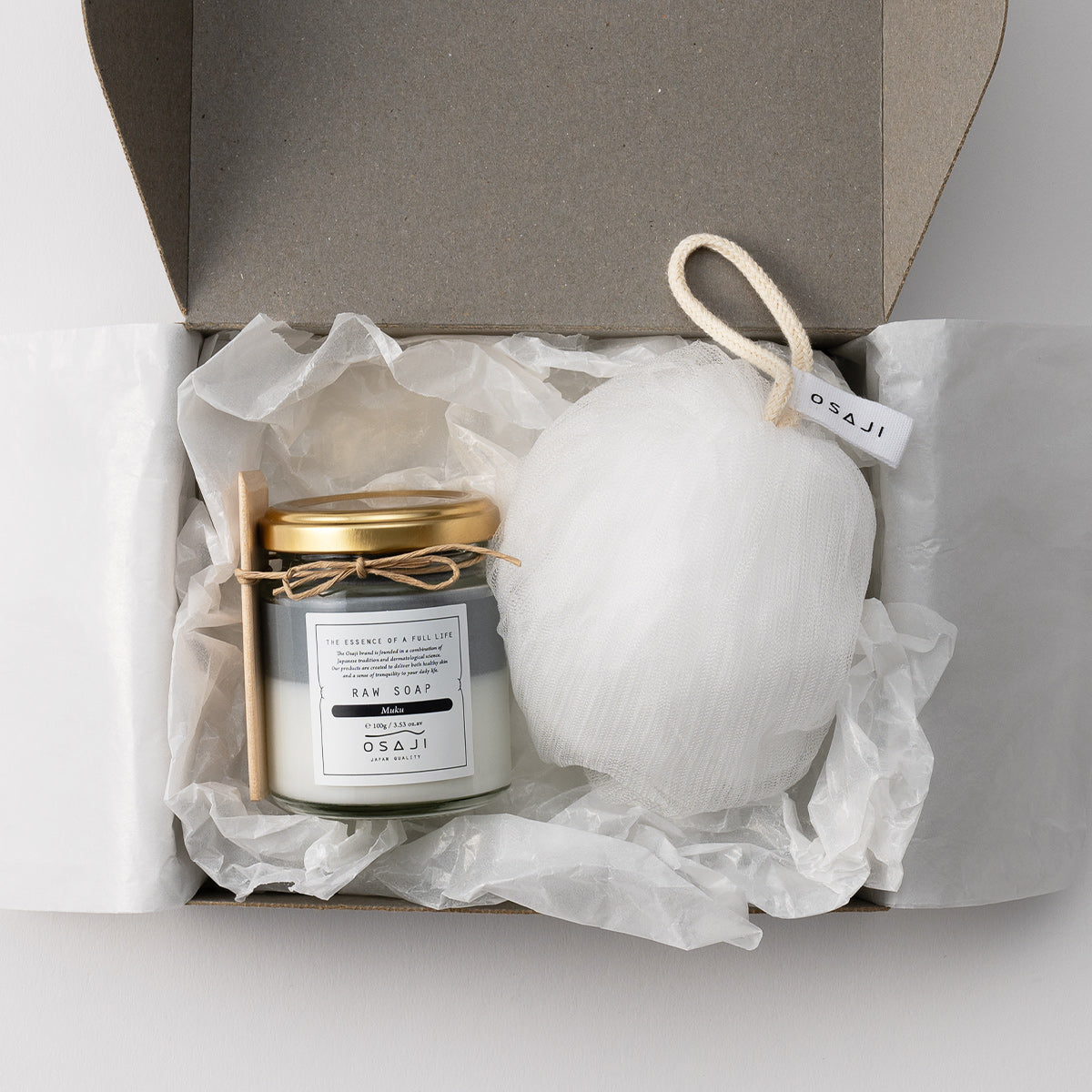 男女問わずお使いいただけるローソープは、さっぱりだけどしっとり。もちもち泡のローソープを贈りものに。・ローソープ(半熟石けん) Muku