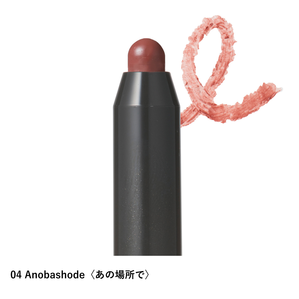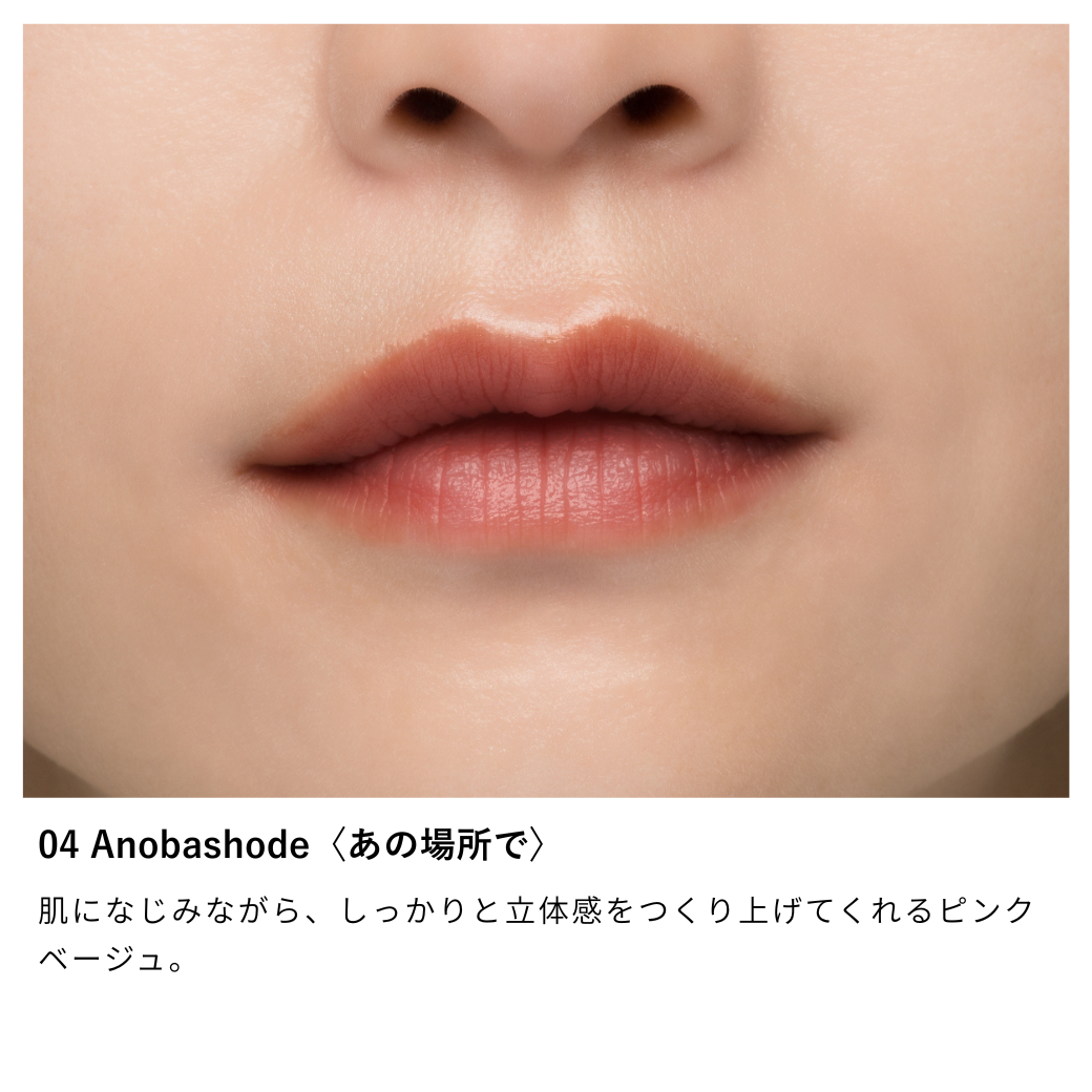 04 Anobashode〈あの場所で〉:リンゴ酸ジイソステアリル、ダイマージリノール酸(フィトステリル/イソステアリル/セチル/ステアリル/ベヘニル)、セレシン、トリエチルヘキサノ イン、パルミチン酸エチルヘキシル、合成ワックス、水添ポリイソブテン、トリイソステアリン酸ポリグリセリル-2、マイクロクリスタリンワックス、ジメチコン、水酸化Al、トコフェ ロール、ラウロイルグルタミン酸ジ(フィトステリル/オクチルドデシル)、酸化鉄、酸化チタン、マイカ、黄4、赤202