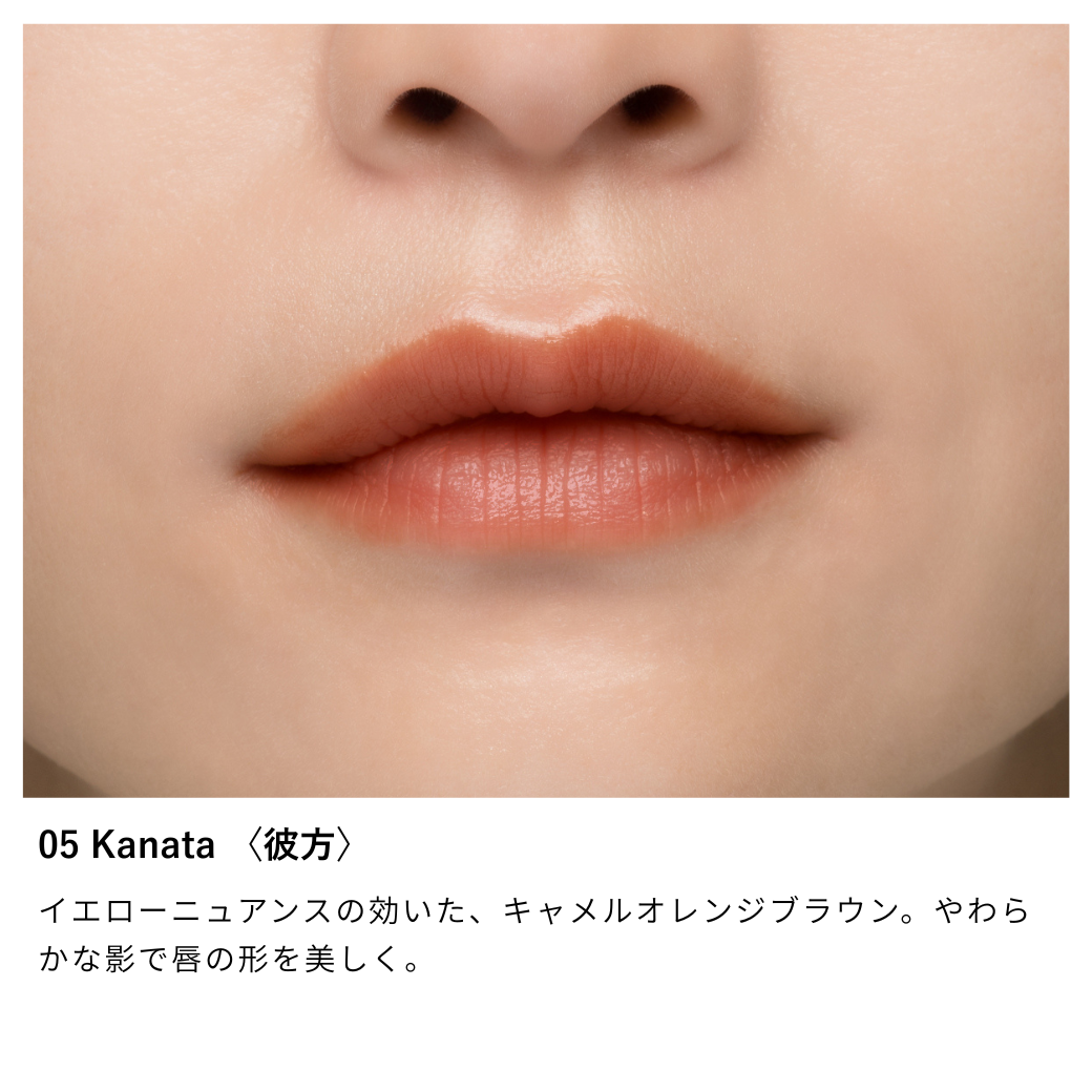 05 Kanata 〈彼方〉:リンゴ酸ジイソステアリル、ダイマージリノール酸(フィトステリル/イソステアリル/セチル/ステアリル/ベヘニル)、セレシン、トリエチルヘキサノイン、パルミチン酸エチルヘキシル、合成ワックス、水添ポリイソブテン、トリイソステアリン酸ポリグリセリル-2、マイクロクリスタリンワックス、ジメチコン、トコフェロール、ラウロイルグルタミン酸ジ(フィトステリル/オクチルドデシル)、水酸化Al、ハイドロゲンジメチコン、酸化鉄、マイカ、酸化チタン、黄4、赤202