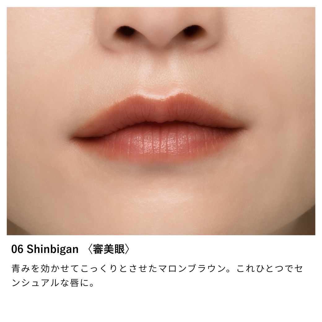 06 Shinbigan 〈審美眼〉:リンゴ酸ジイソステアリル、ダイマージリノール酸(フィトステリル/イソステアリル/セチル/ステアリル/ベヘニル)、セレシン、トリエチルヘキサノイン、パルミチン酸エチルヘキシル、合成ワックス、水添ポリイソブテン、トリイソステアリン酸ポリグリセリル-2、マイクロクリスタリンワックス、ジメチコン、トコフェロール、ハイドロゲンジメチコン、ラウロイルグルタミン酸ジ(フィトステリル/オクチルドデシル)、水酸化Al、酸化鉄、マイカ、赤202、酸化チタン