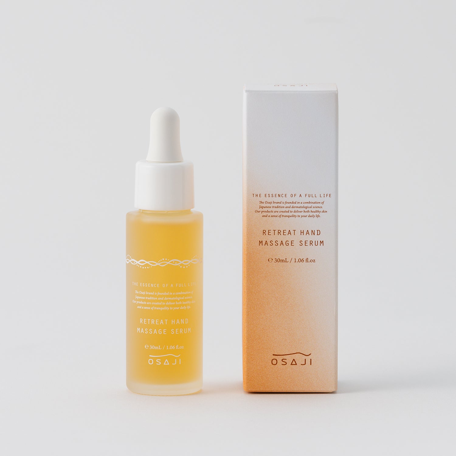 ・滑りが悪くなったらマッサージ終了の合図です。乾燥を感じる場合や、物⾜りない時は、多めにとりお使いください。リトリートハンドモイストクリームを重ねて使うと、うるおいを閉じ込める効果が増し、より一層しなやかな手元に仕上がります。