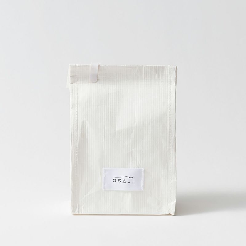 過剰なゴミ資源を極力軽減していくだけでなく、“OSAJIのギフト”を楽しんでいただきたい。その想いとともに、「ギフトとしてもらって嬉しい」、「その後も使いたい」と思えるデザインを追求いたしました。素材は白の筋糸入りクラフト紙で、破れにくく強度も重視。 クラフト紙ならではの風合いは、折れやシワもデザインの一部として、OSAJIならではのニュアンスを醸し出しています。中に入れる商品のサイズに応じて、折り曲げてクリップで止めるラフなデザインです。クリップも紙製のクリップを採用しています。ギフトバックの外側にそのままメッセージを書き込んだり、イラストを書いたり。オリジナリティ溢れるギフトとしてアレンジは自由自在!贈りたい人を思い浮かべて、さまざまなアレンジをお楽しみください。中身を出したあとは、ポーチとして、小物入れとして、インテリアとしてなど、再活用いただくことが可能です。