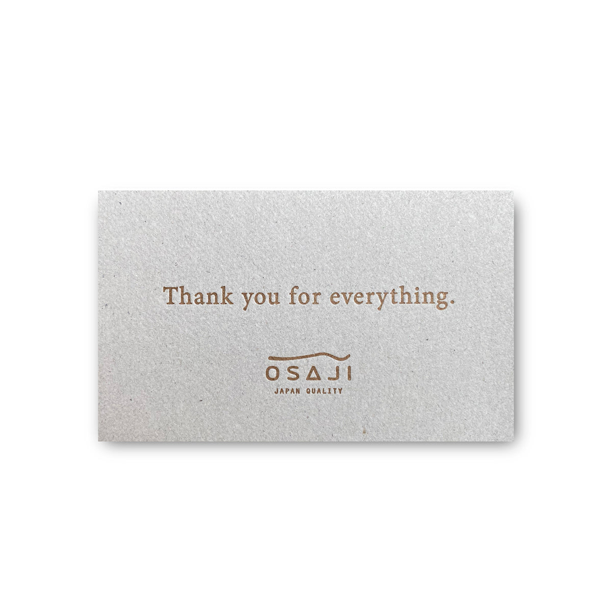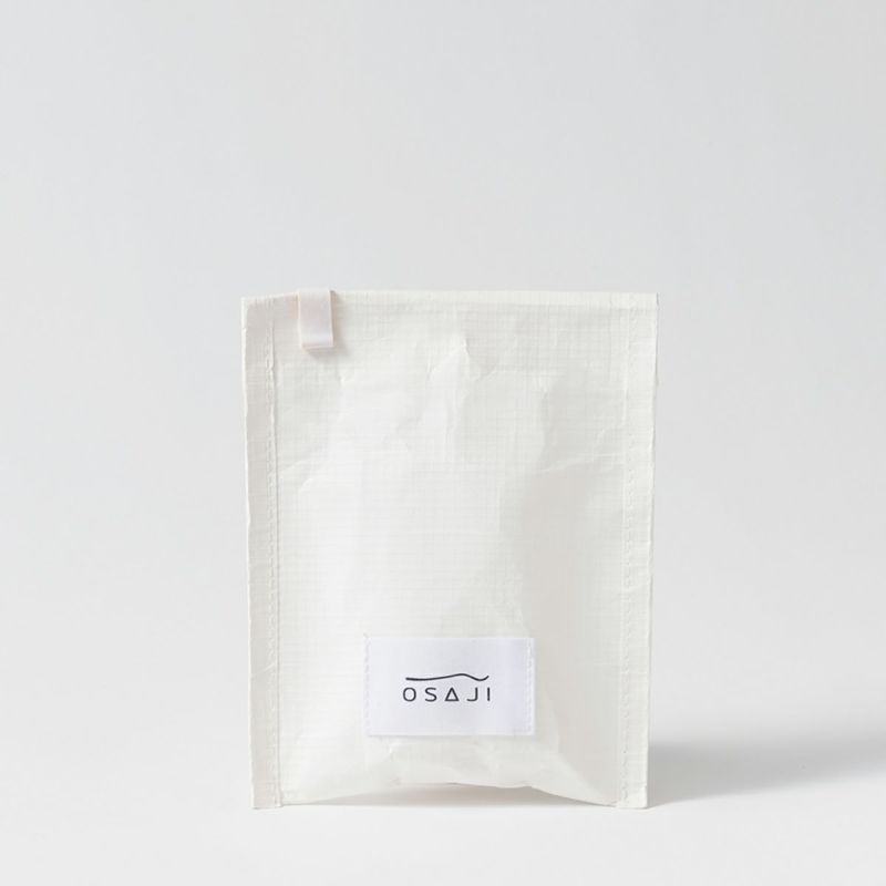 過剰なゴミ資源を極力軽減していくだけでなく、“OSAJIのギフト”を楽しんでいただきたい。その想いとともに、「ギフトとしてもらって嬉しい」、「その後も使いたい」と思えるデザインを追求いたしました。素材は白の筋糸入りクラフト紙で、破れにくく強度も重視。 クラフト紙ならではの風合いは、折れやシワもデザインの一部として、OSAJIならではのニュアンスを醸し出しています。中に入れる商品のサイズに応じて、折り曲げてクリップで止めるラフなデザインです。クリップも紙製のクリップを採用しています。ギフトバックの外側にそのままメッセージを書き込んだり、イラストを書いたり。オリジナリティ溢れるギフトとしてアレンジは自由自在!贈りたい人を思い浮かべて、さまざまなアレンジをお楽しみください。中身を出したあとは、ポーチとして、小物入れとして、インテリアとしてなど、再活用いただくことが可能です。