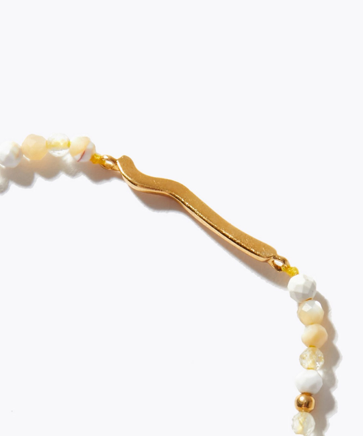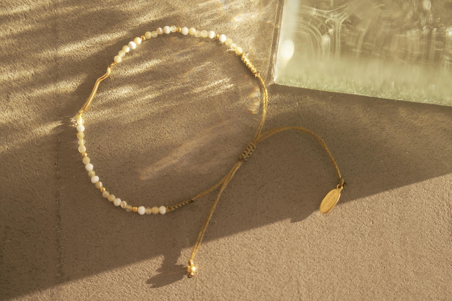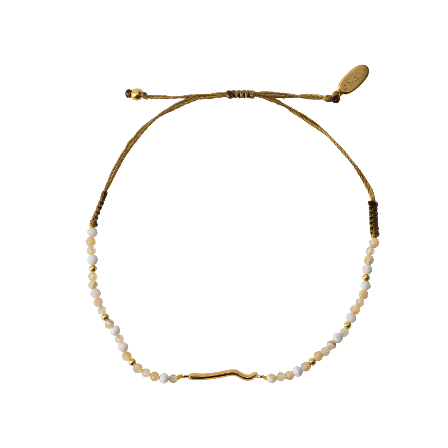 優しい色合いが特徴の天然石、マザーオブパール、ハウライト、ルチルクォーツを使用したコラボレーションブレスレット。OSAJIのロゴをモチーフにしたチャーム、エンドプレートにはオサジとアルティーダ ウードのWネームが施されています。