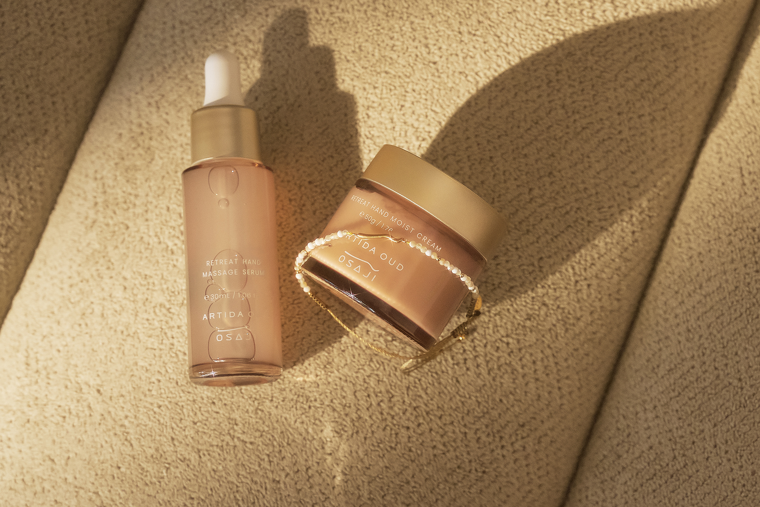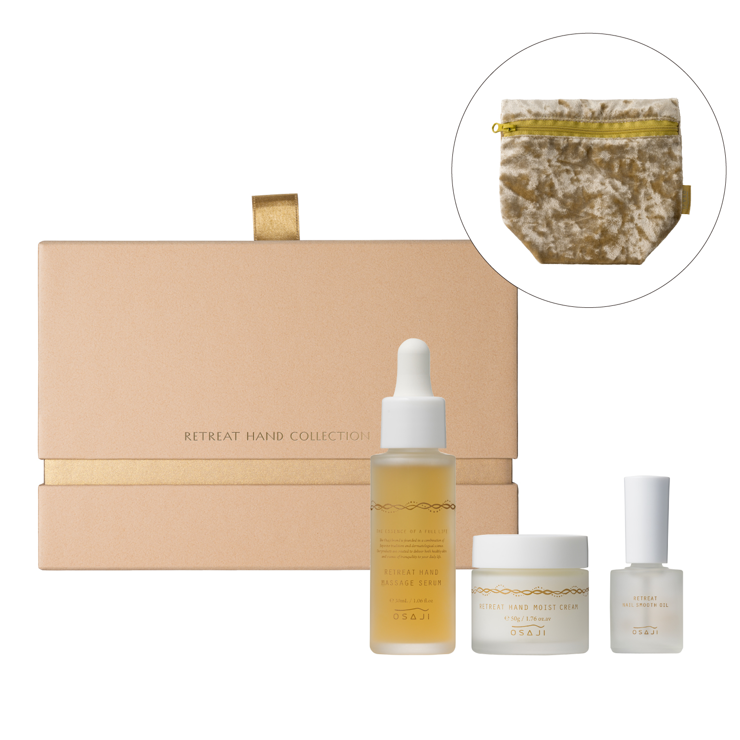特別デザイン・調香のハンドケアアイテム「リトリート ハンド シリーズ」とこのセットでしか手に入らないOSAJIのロゴをモチーフにしたチャームをあしらったブレスレットを組み合わせた、スペシャルなセットをご用意しました。