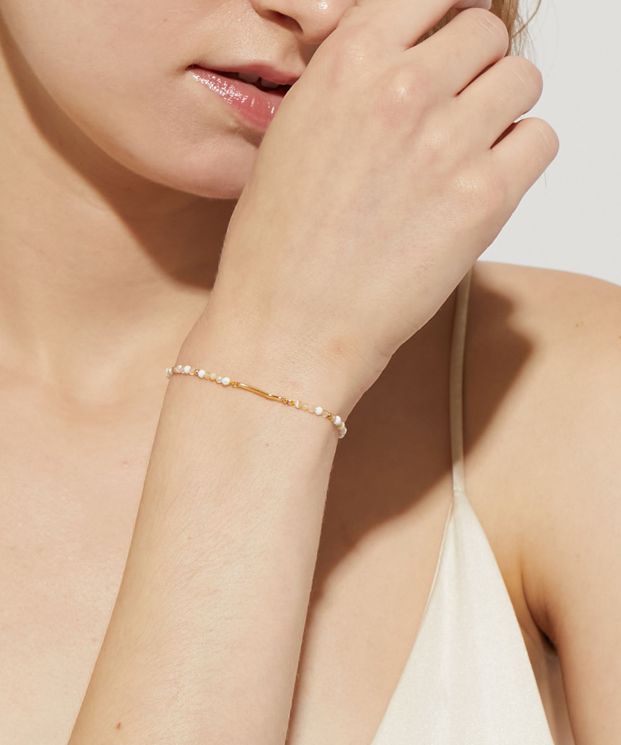 優しい色合いが特徴の天然石、マザーオブパール、ハウライト、ルチルクォーツを使用したコラボレーションブレスレット。